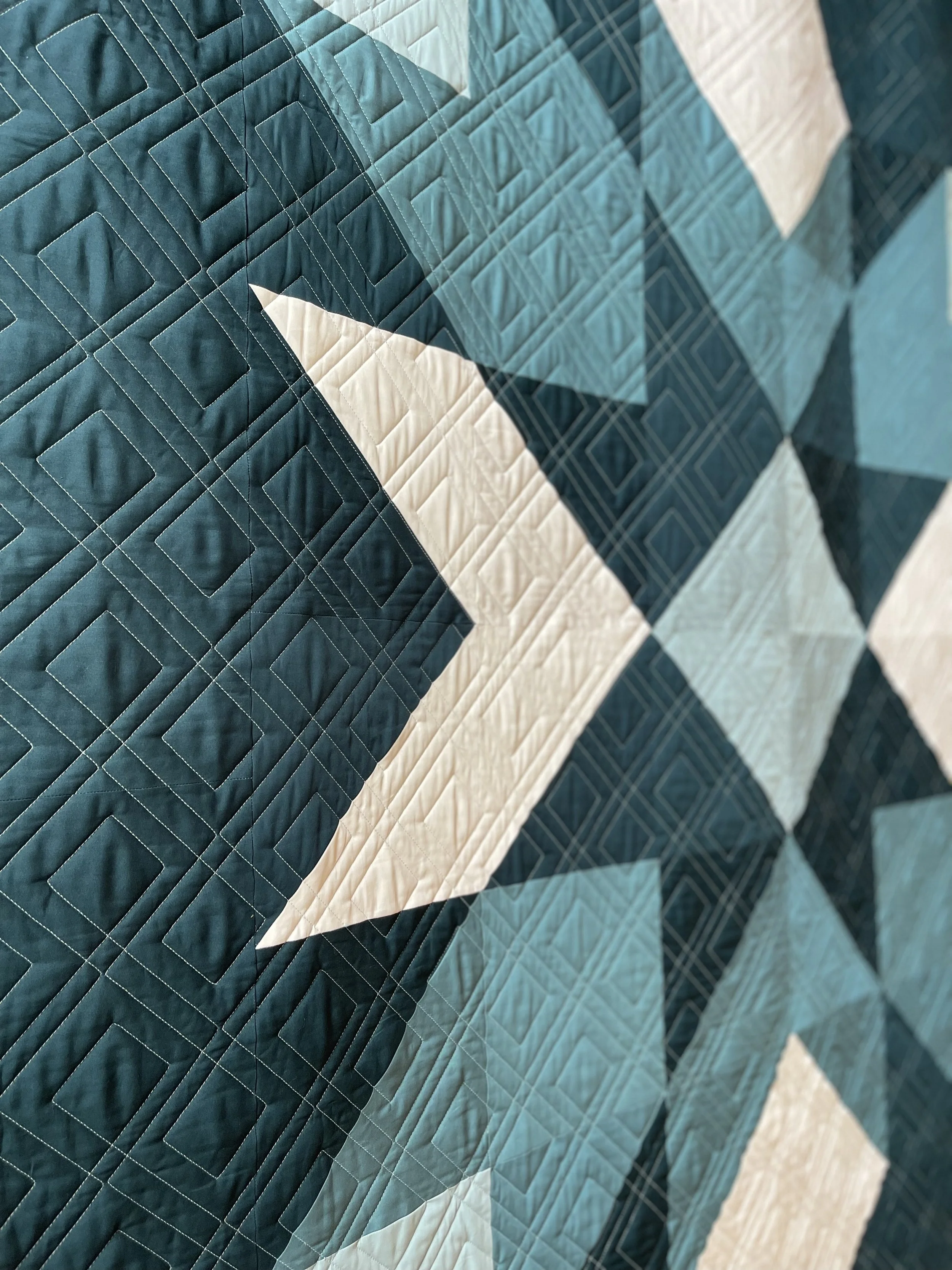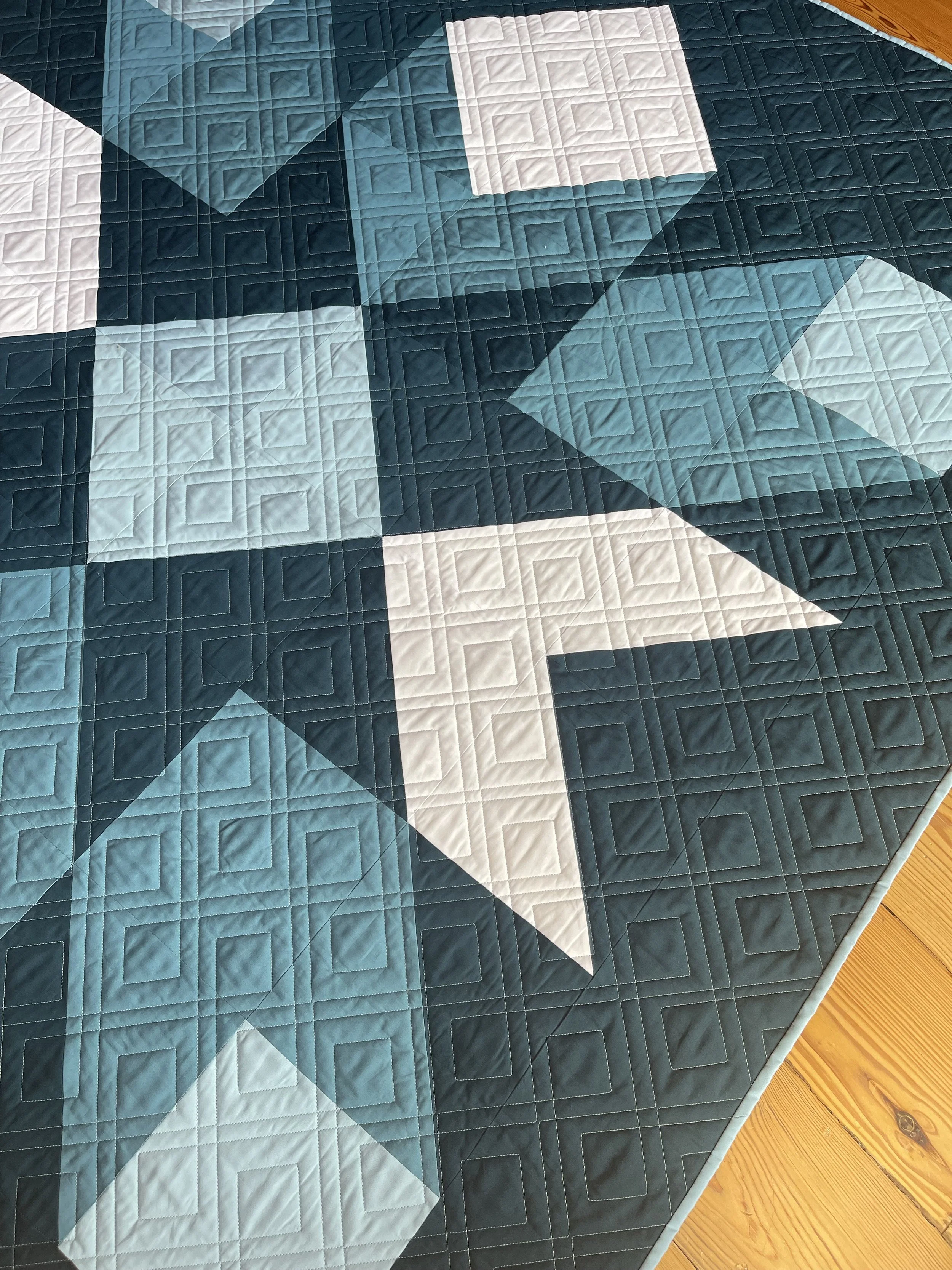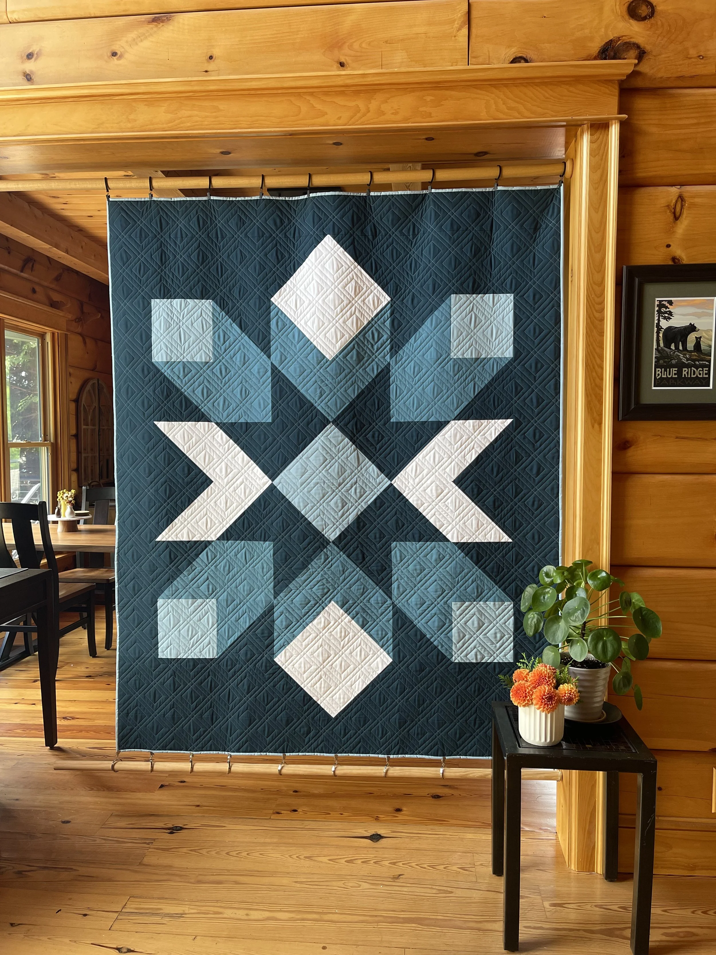 Mt. Mitchell, one of four patterns in the Land of the Sky collection, shines bright as a very beginner-friendly pattern. The design features large-scale half-square triangles and squares which are striking in solids but also great for showcasing prints. The colors of the cover quilt represent a star in the night sky, appearing to almost leap out of the fabric in 3D. Mt. Mitchell is named for the highest peak east of the Mississippi, perfect for stargazing in the Appalachian Mountains at an elevation of 6,684 ft.